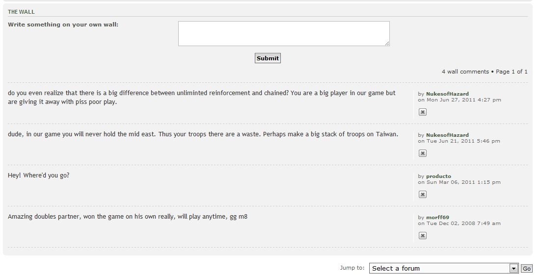 he posted on my wall prior to posting in game chat about trying to form a diplomacy agaisnt player blue in game, then in game chat tryed covering his own behind, deleted his wall posts, and became abussive to a degree,
