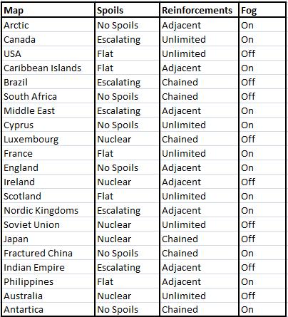 For example, in Round 1 players A, B, C & D play on the Scotland map; Players E, F, G & H play on the Nordic Kingdoms map. Players B and H win. In Round 2, players A, C, D & the winner of the Luxembourg map battle it out in Scotland; players B, E, F & G play the Nordic Kingdoms map; player H moves on to the Soviet Union.