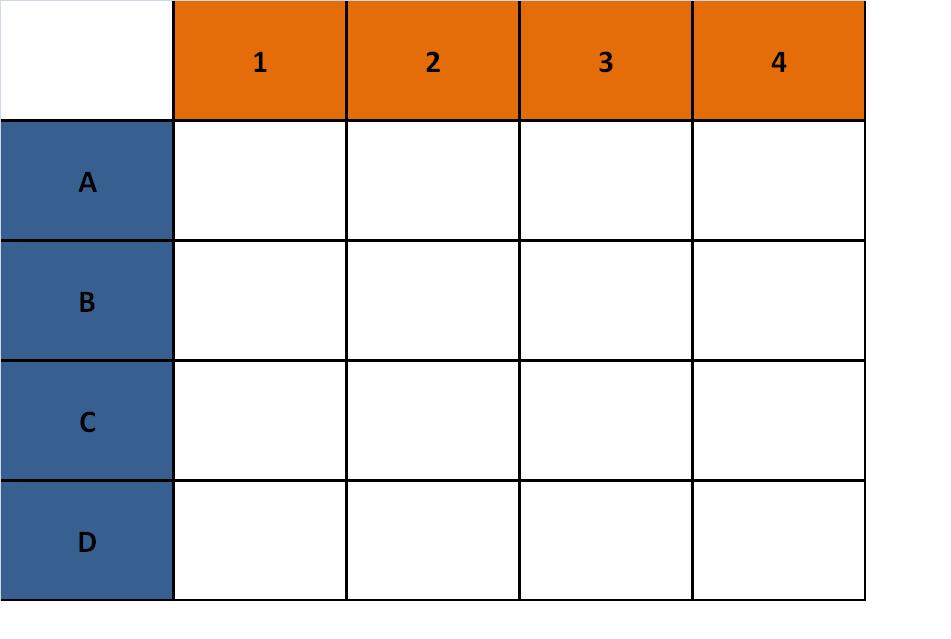 Round 1: You will form a team with all the players on the same horizontal row as yourself. You will play three Quads games, one against each of the other teams. So, Team A vs. Team B, Team A vs. Team C, Team A vs. Team D, and so on.