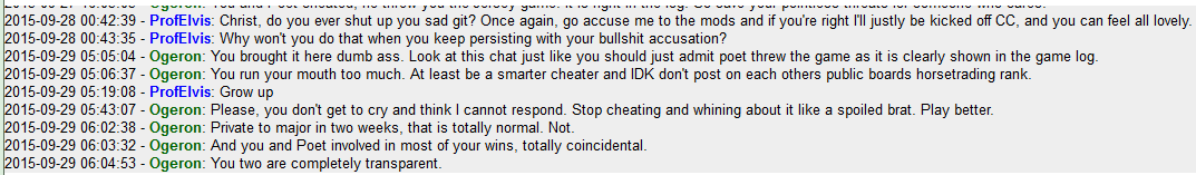 Comments: I don't know if its enough to meet your definition of severe pm abuse, but this crap is spoiling the ejoyment of playing on here. I teach, and this is a good brief respite from that (I'm typing at6am GMT, having been up a few hours). Ogeron just won't quit with the accusation of cheating and seems to be winding himself into an ever greater fury, and getting more heated in his comments - not always getting the best judged responses from me, something else I don't want to be doing. There's more in chat in other finished games now off my central command, but Ogeron won't actually match his cheating accusation with a complaint nor cease posting that I'm a cheat, with additional personal abuse. A bit of fun, escapism, is becoming a serious drag.