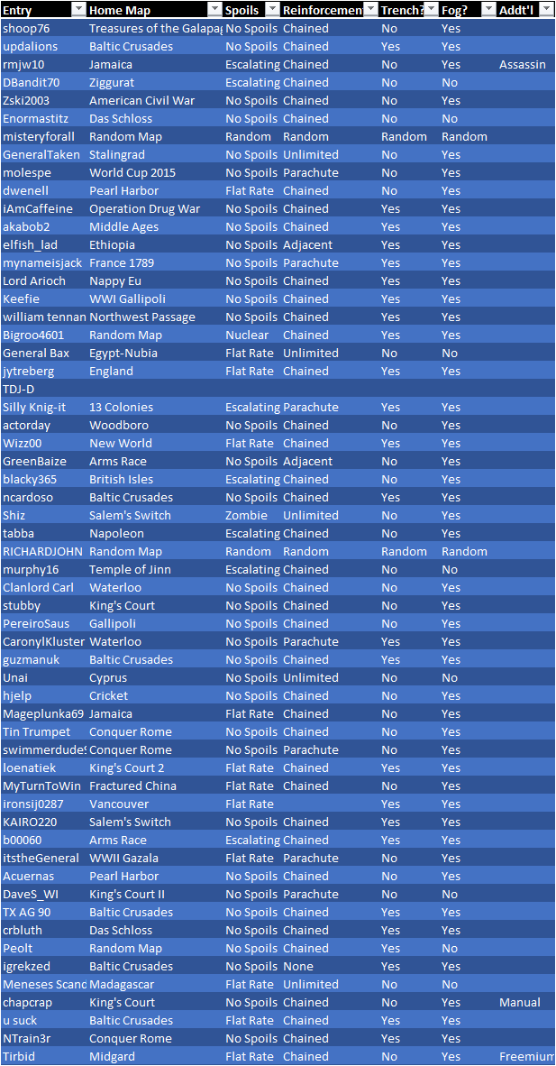 Just an update on who we have for this tournament so far, there were a few instances where I was entering this into the spreadsheet and the same person posted twice on this thread and a few were different the second time so I went with the first post. Double check that the settings I have listed for you are correct.